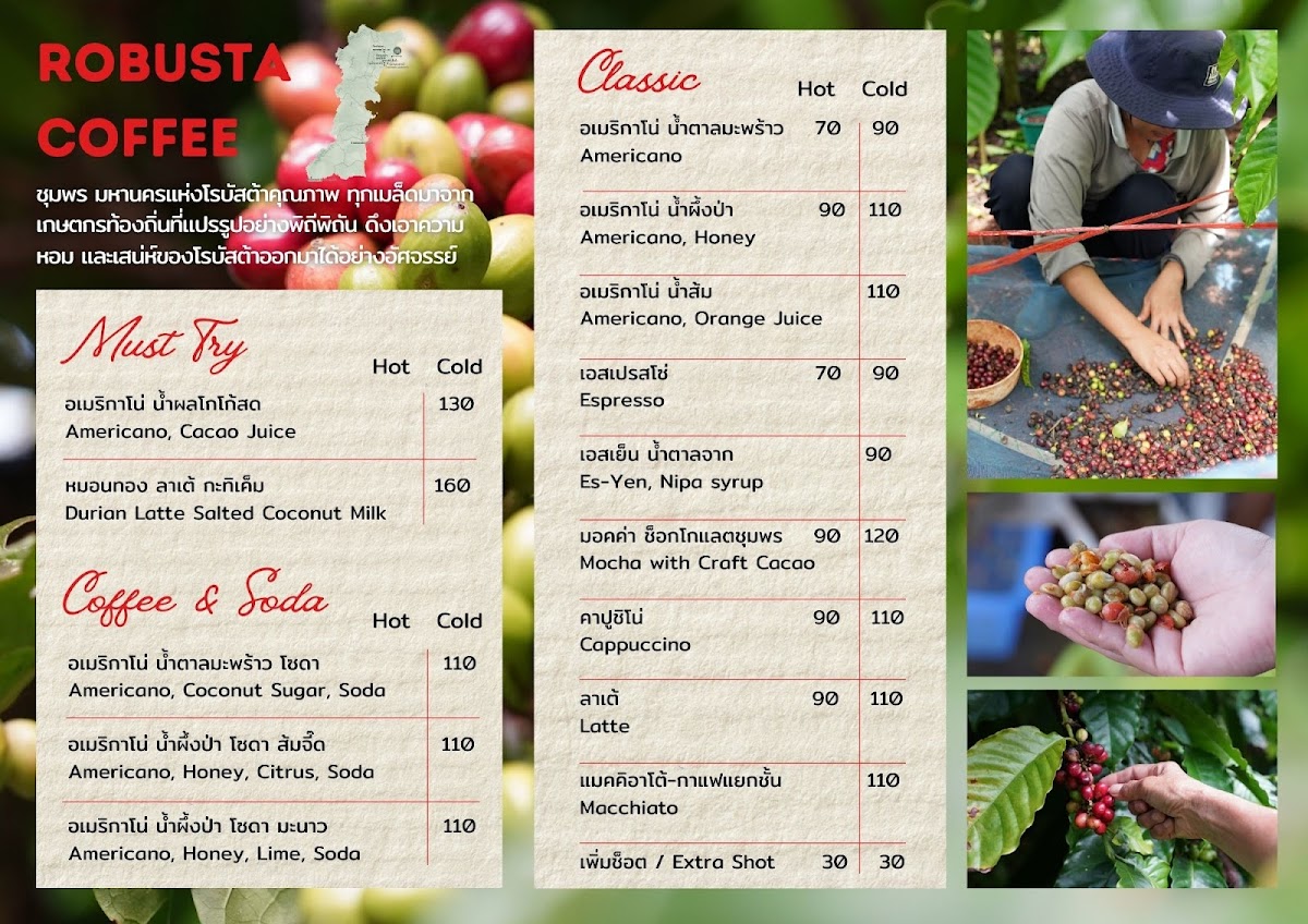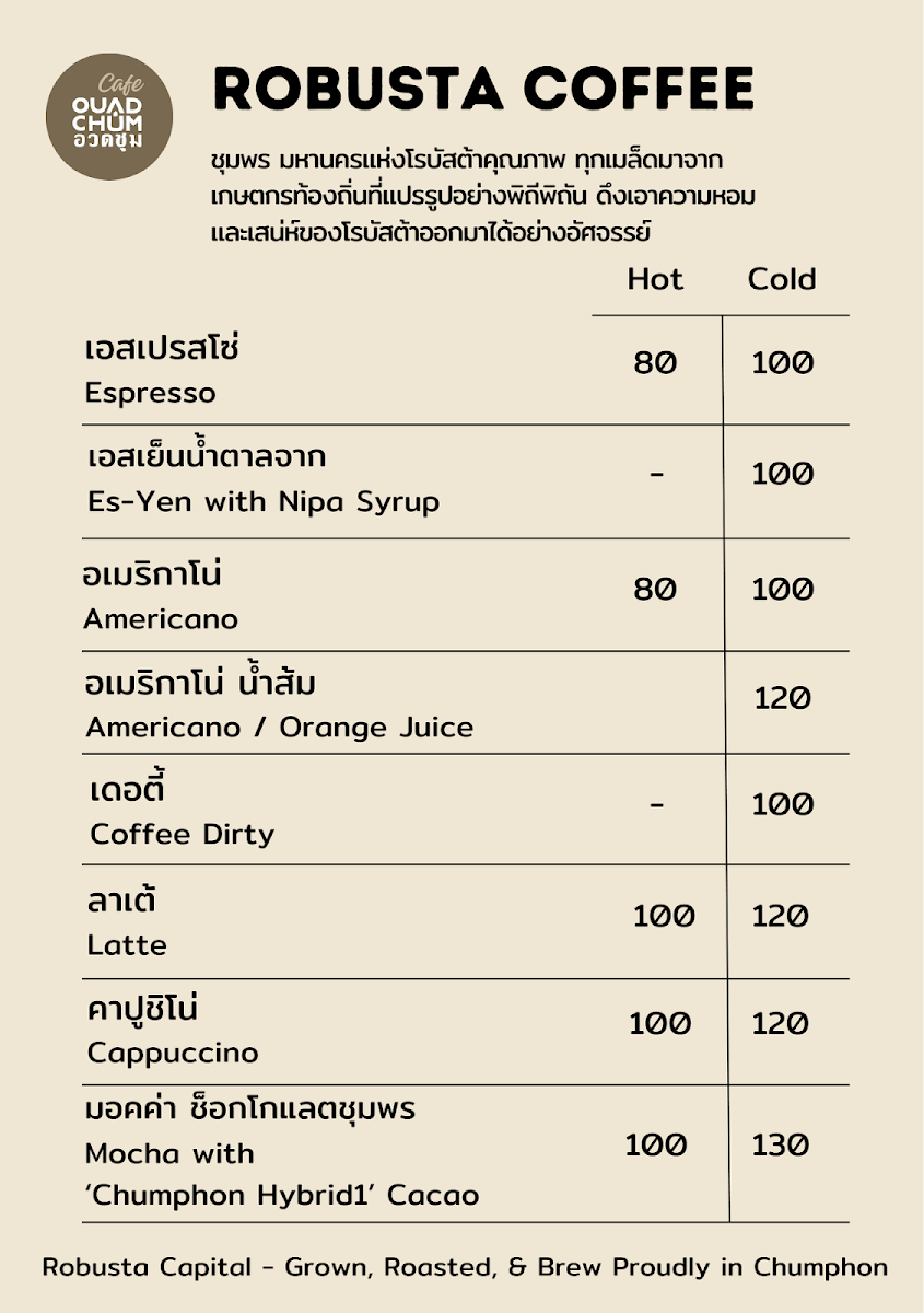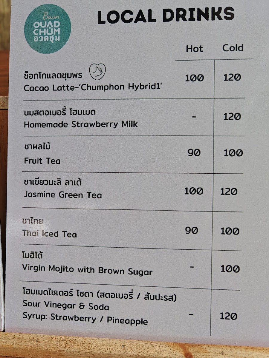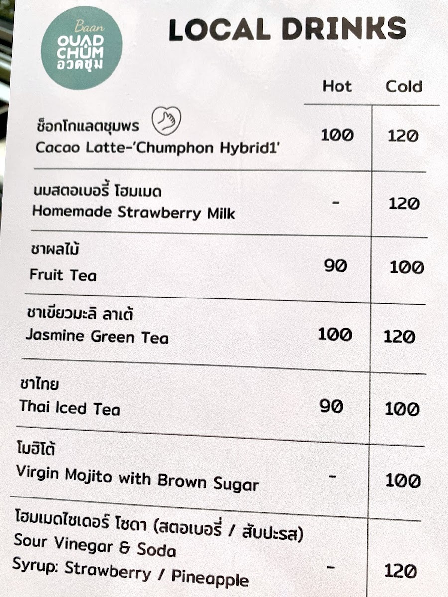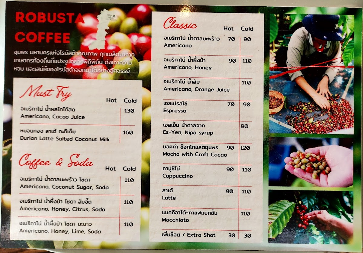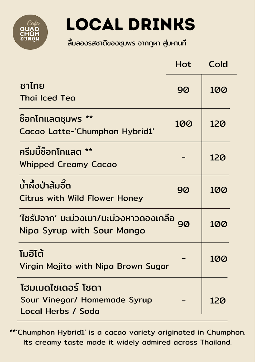 The menu offers a selection of coffee, crafted drinks, and light food items suitable for breakfast and casual dining. Visitors can expect locally sourced ingredients featured in beverage options, including coffee and chocolate from the Chumphon region. The drink menu includes coffee-based beverages as well as soft drinks. Light meals and snacks complement the beverage offerings, providing suitable choices for coffee breaks or light bites throughout the day.